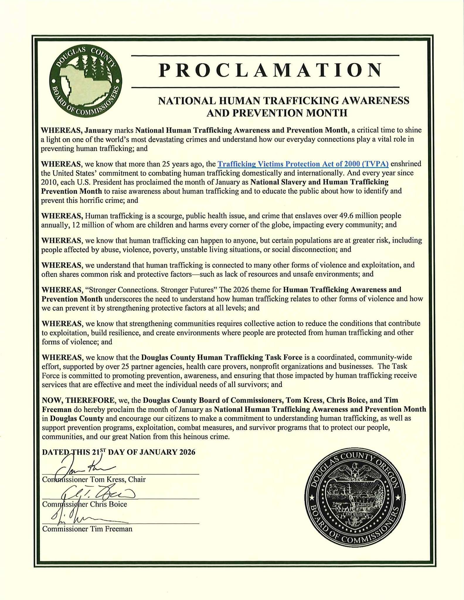 DOUGLAS COUNTY, Ore. — The Douglas County Board of Commissioners issued a proclamation Wednesday declaring January 2026 as National Human Trafficking Awareness and Prevention Month in Douglas County.