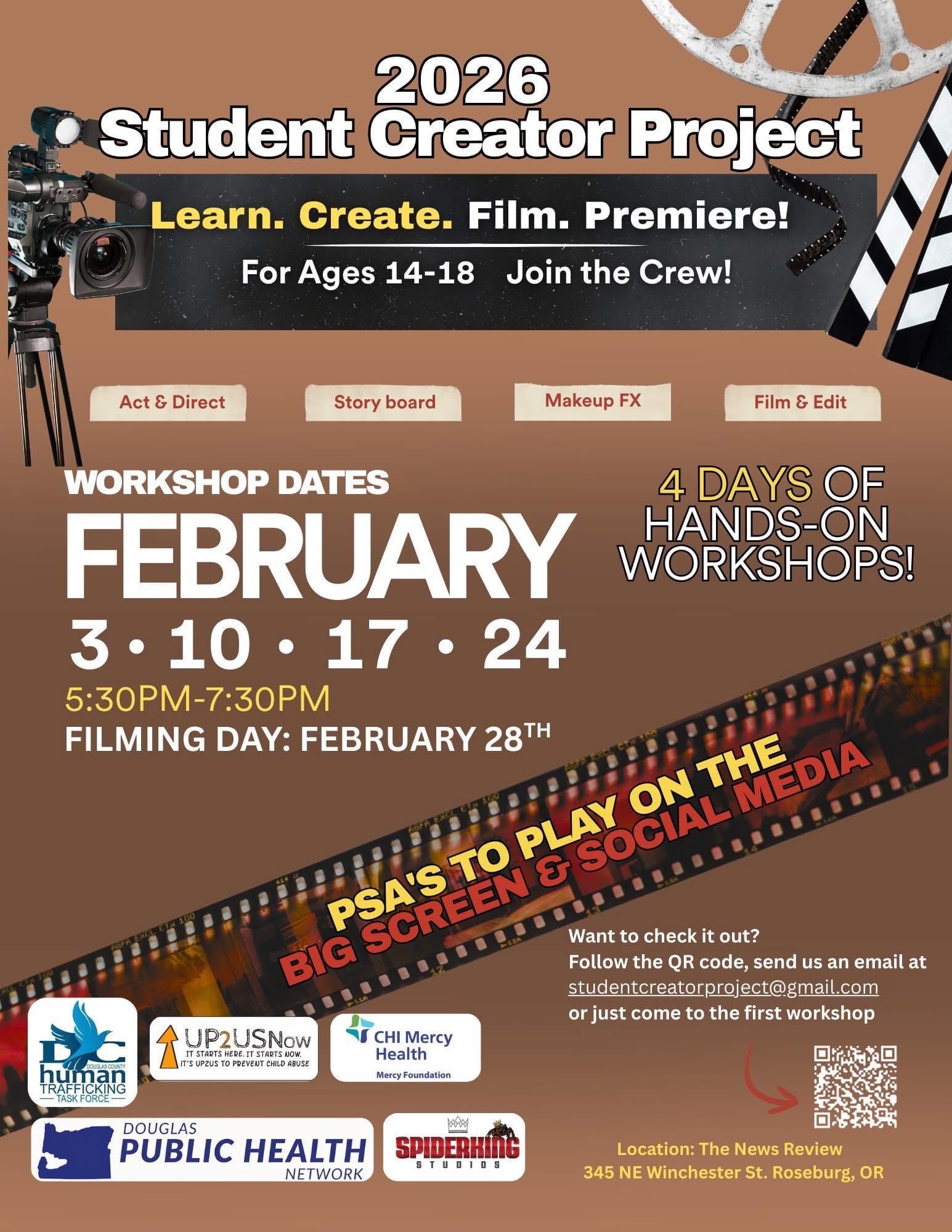 Workshops will be held on February 3rd, 10th, 17th and 24th from 5:30 p.m. to 7:30 p.m. They will take place at the Lotus Media building, which includes The News Review, at 345 Northeast Winchester Street near downtown Roseburg. The filming day will be February 28th.