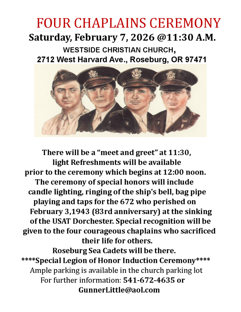 The 14th annual Four Chaplains Service is this Saturday at 12:00 p.m. at Westside Christian Church on West Harvard Avenue in Roseburg.