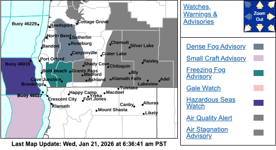 Forecasters at the National Weather Service in Medford said poor air quality will continue. This is due to an inversion and stagnant air conditions near the surface that will continue to trap pollutants. Air quality unhealthy for sensitive groups may develop.