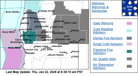 Forecasters at the National Weather Service in Medford said poor air quality will continue. This is due to an inversion and stagnant air conditions near the surface that will continue to trap pollutants. Poor air quality may cause issues for people with respiratory problems. Those with respiratory illness should follow their physician’s advice for dealing with high levels of air pollution during periods of stagnant air.