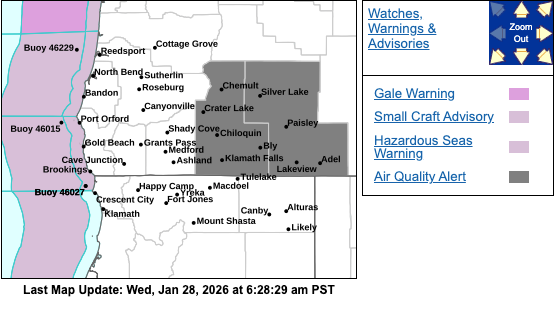 The Advisory area includes Crater Lake National Park, Klamath Falls, Lakeview, and surrounding locations.