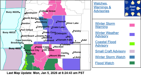 A Winter Weather Advisory remains in effect through 4:00 p.m. Monday for areas above 5,000 feet in the Southern Oregon Cascades including Crater Lake, Diamond, and Crescent Lake along with highways 138, 230 and 62.