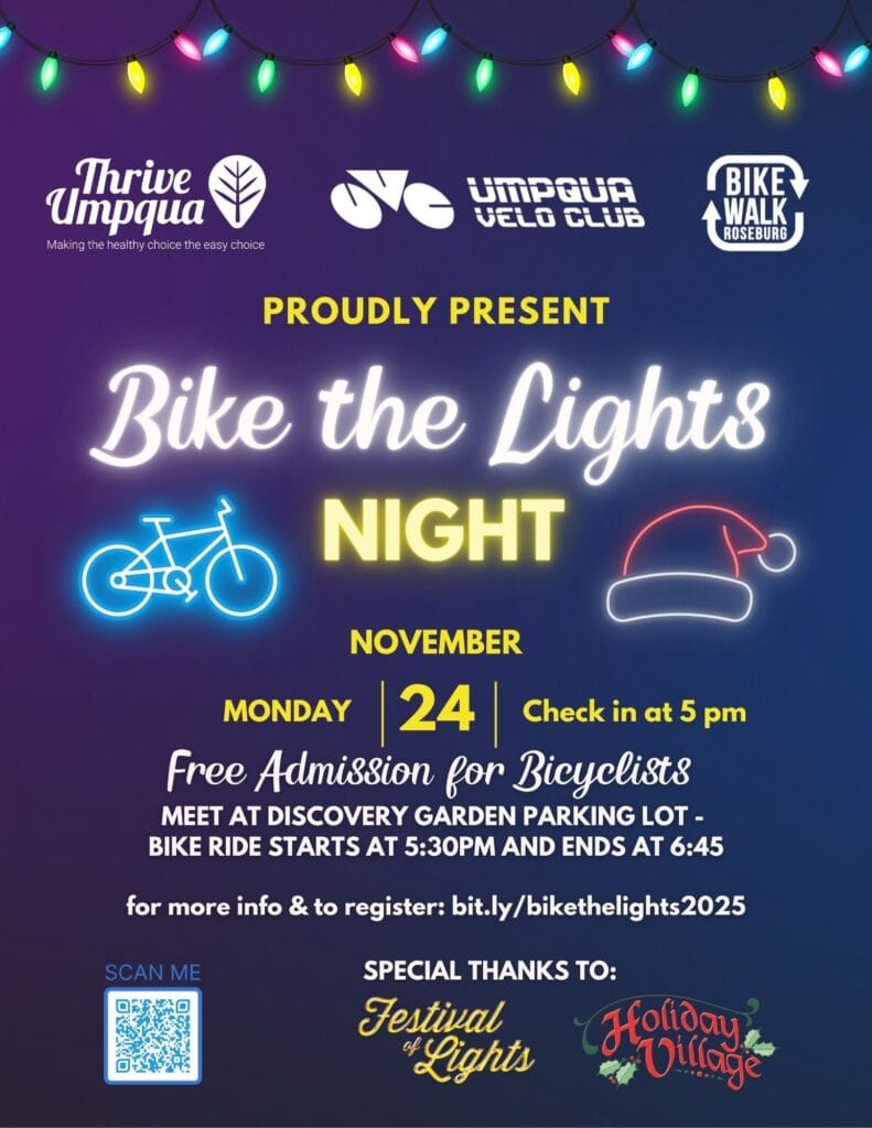 A release said this family-friendly cycling event through the Festival of Lights at River Forks Park is a unique holiday experience made possible through a partnership with the Umpqua Velo Club, Bike Walk Roseburg, the Festival of Lights and the Roseburg Rotary Club. Last year over 200 people attended, decked out in their best holiday light- up gear.