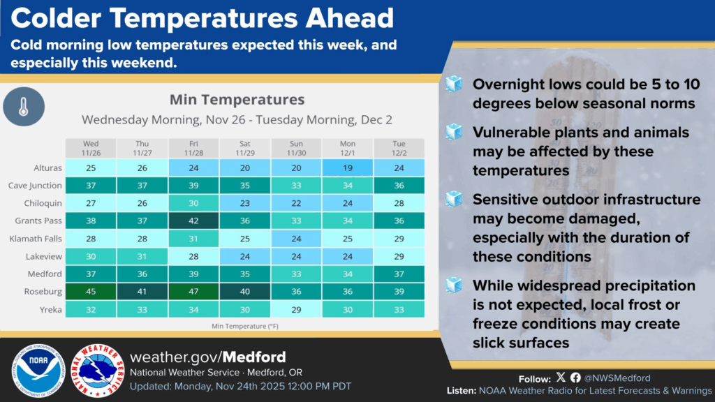 Colder low temperatures are expected for the next several days in southern Oregon.