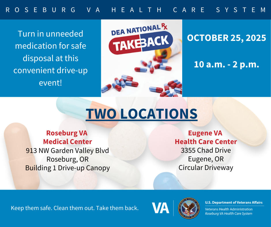 It will be held from 10:00 a.m. to 2:00 p.m. under the Building 1 drive-up canopy on the Roseburg VA campus on Northwest Garden Valley Boulevard. In Lane County, the event will be held at the Eugene VA Health Care Center on Chad Drive, in the circular driveway.