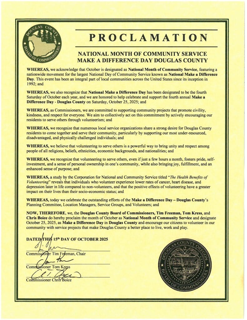 Douglas County Commissioners Tim Freeman, Tom Kress and Chris Boice issued a proclamation at their weekly business meeting on Wednesday calling upon all citizens of the county to observe October as the National Month of Community Service and Make a Difference Day, which is celebrated every year on the fourth Saturday of the month.