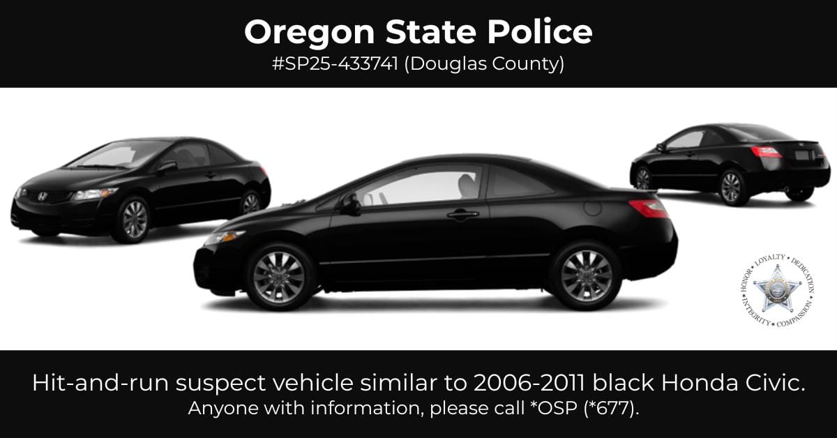 The release said roadside evidence suggests the vehicle involved is a 2006-2011 black Honda Civic. Evidence from the scene indicated the vehicle sustained damage to the driver’s side mirror. Law enforcement also recovered an adhesive transparent window visor believed to have come from the driver’s side door.