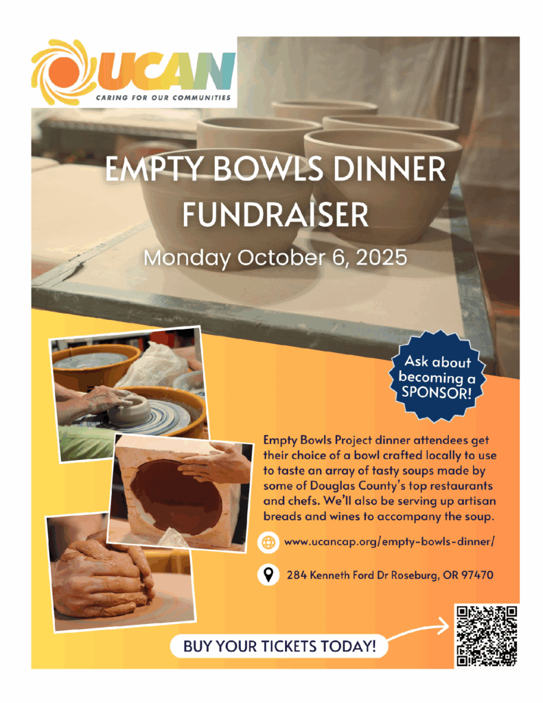 A UCAN release said Empty Bowl’s is UCAN’s annual community event to fight hunger. Local potters, craftspeople, educators and community members create handcrafted bowls, and attendees enjoy the experience of selecting a bowl and sharing a meal of soup and bread. At the end of the evening, guests can take their bowl home as a reminder of empty bowls in the community or donate it back for future years.
