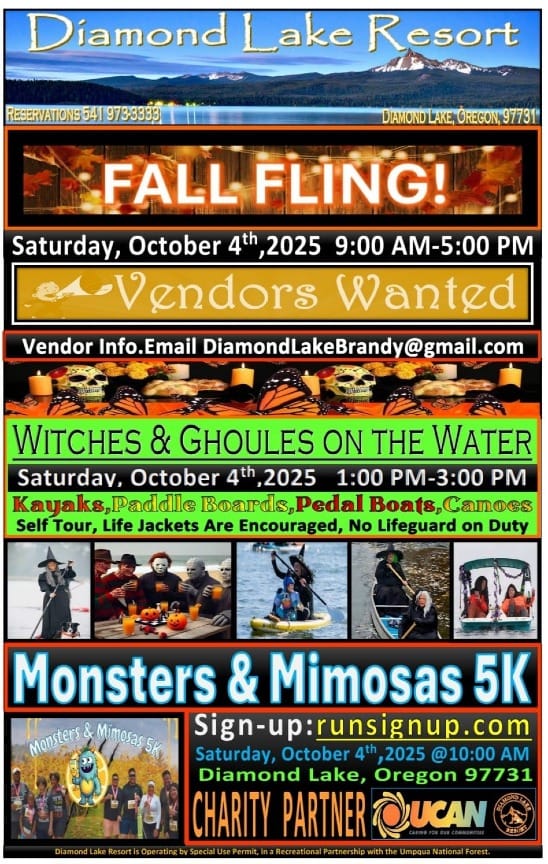 Diamond Lake Resort will host its first-ever Fall Fling on Saturday, October 4, from 9:00 a.m. to 5:00 p.m., featuring a day full of outdoor fun, local vendors, and community activities.