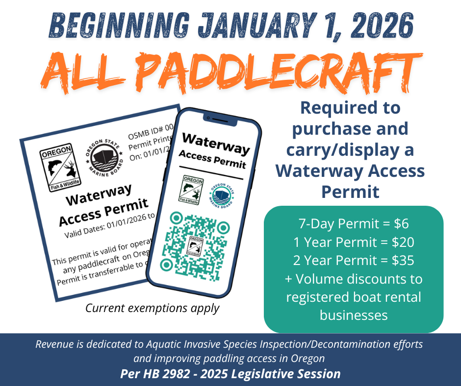 Oregon’s new 2026 waterway rules require nearly all paddlecraft: kayaks, SUPs, rafts, and more - to carry a Waterway Access Permit. Fees start at $6, with funds supporting access, safety, and invasive species prevention statewide.