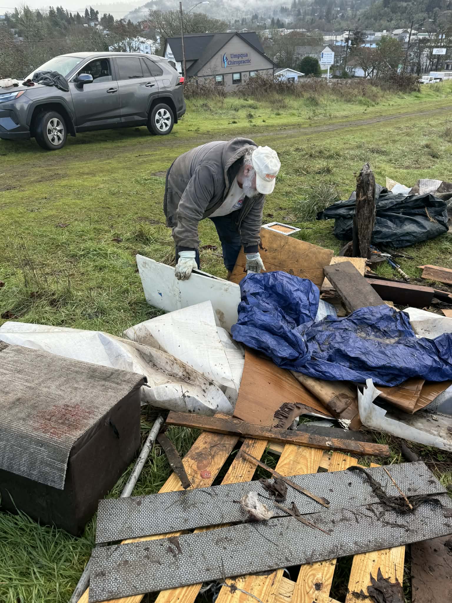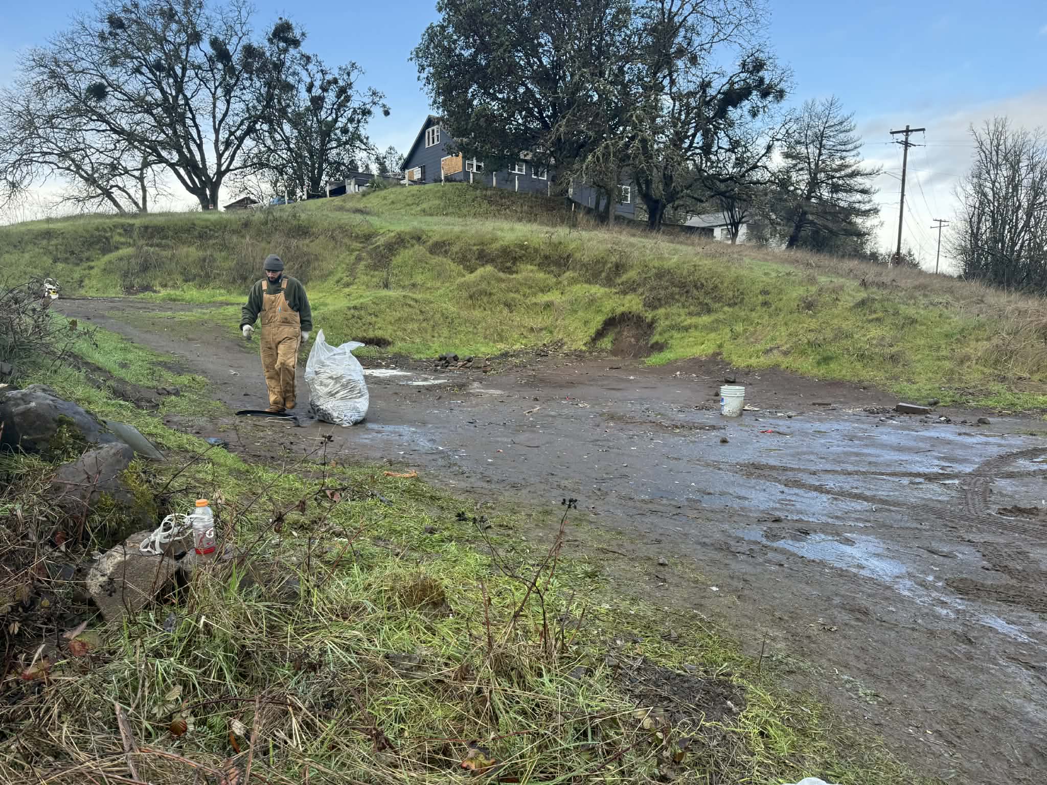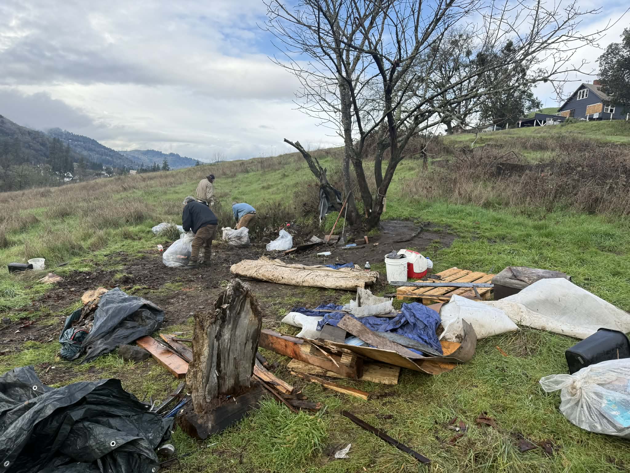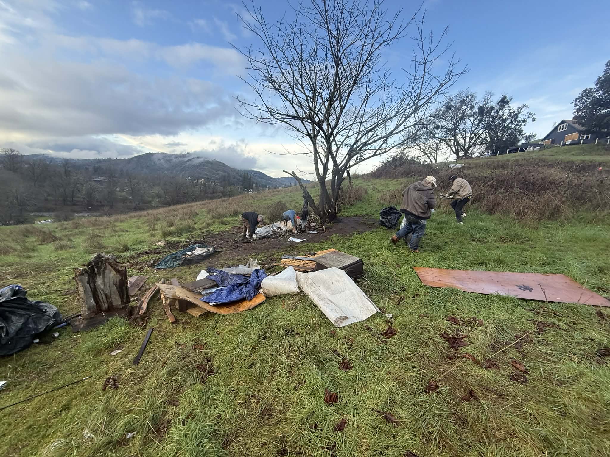 A Roseburg hillside property was largely cleaned up this weekend (Jan 2 - 4) through a coordinated effort by local volunteers, residents of managed camps, and Elk Island Trading LLC following a nuisance notice issued to the homeowner.